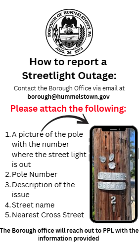 Contact the Borough Office via email at borough@hummelstown.gov and attach the following information: