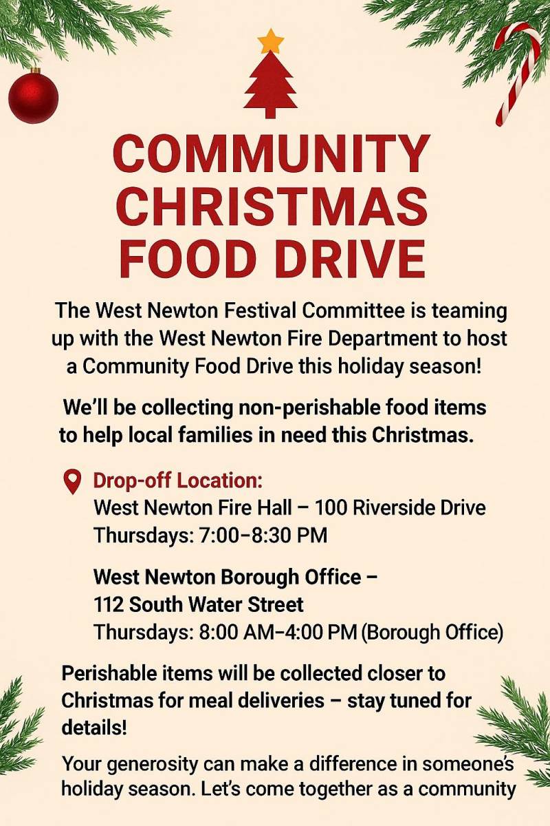 The West Newton Festival Committee is teaming up with West Newton Volunteer Fire Department to host a Community Food Drive this holiday season.