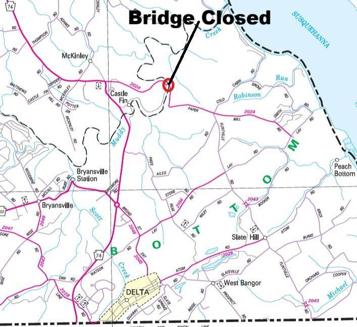 Harrisburg, PA – The Pennsylvania Department of Transportation (PennDOT) announced today that a bridge on Paper Mill Road (Route 2024) over the north branch of Muddy Creek was struck over the weekend and is closed until further inspection and/or repairs can be made. The 88-year-old bridge is located between Route 74 in Lower Chanceford Township and Flintville Road in Peach Bottom Township in southeastern York County.