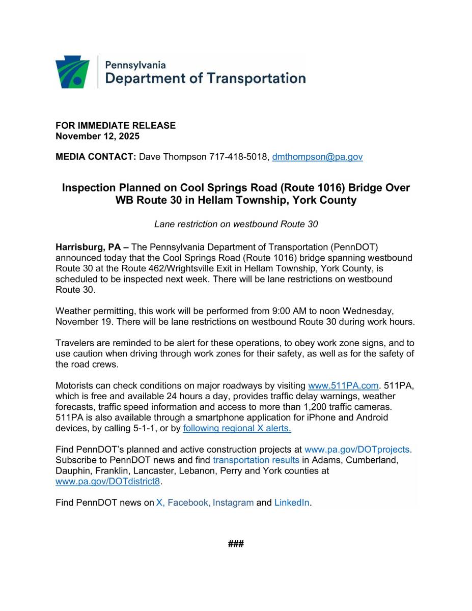 Harrisburg, PA – The Pennsylvania Department of Transportation (PennDOT) announced today that the Cool Springs Road (Route 1016) bridge spanning westbound Route 30 at the Route 462/Wrightsville Exit in Hellam Township, York County, is scheduled to be inspected next week. There will be lane restrictions on westbound Route 30.