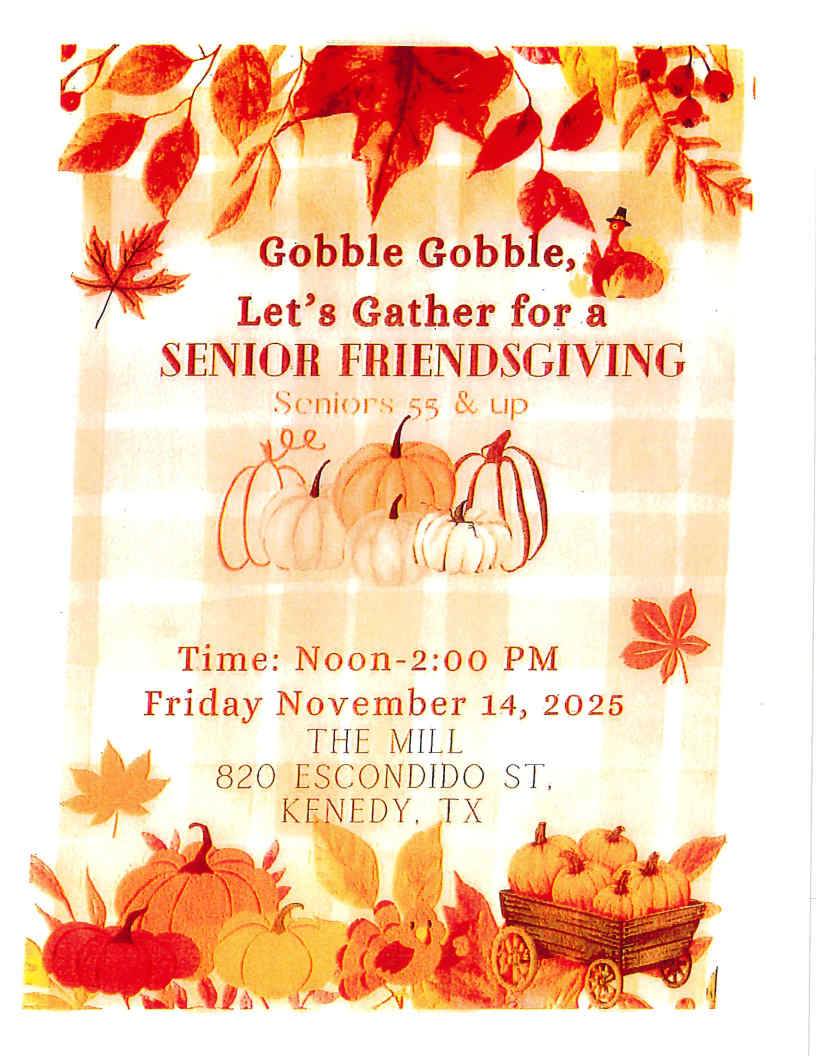 Join us for a heartwarming Senior Friendsgiving on Friday, November 14, 2025, at The Mill (820 Escondido St., Kenedy, TX 78119)!