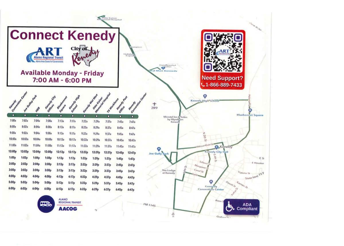 Also a friendly reminder to use our Connect Kenedy Transportation Services by Alamo Rural Transit. (see their bus schedule below).