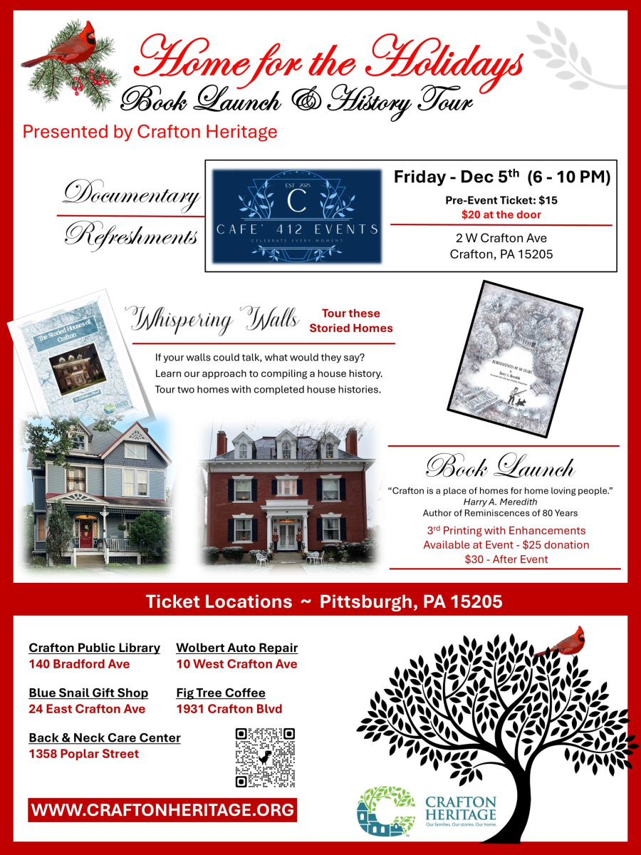 · Be the first to grab a copy of the book Reminiscences of 80 Years, a peek into the early days of Crafton. Discounted $5 at the event.