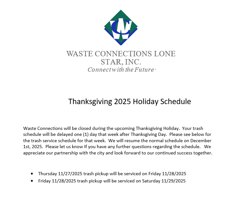 Attached you will find the Holiday trash Schedule for the week of Thanksgiving. If you have any questions, please feel free to contact the City Hall with any questions, AS ALWAYS PLEASE SHARE WITH THOSE WHO MAY NOT HAVE SAVVY CITIZEN.