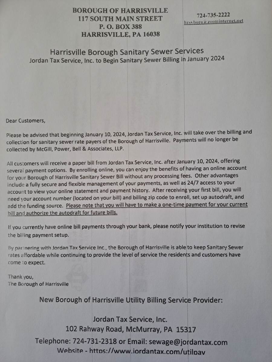 Beginning January 1, 2026, the Harrisville Borough Office will no longer accept sewer payments.