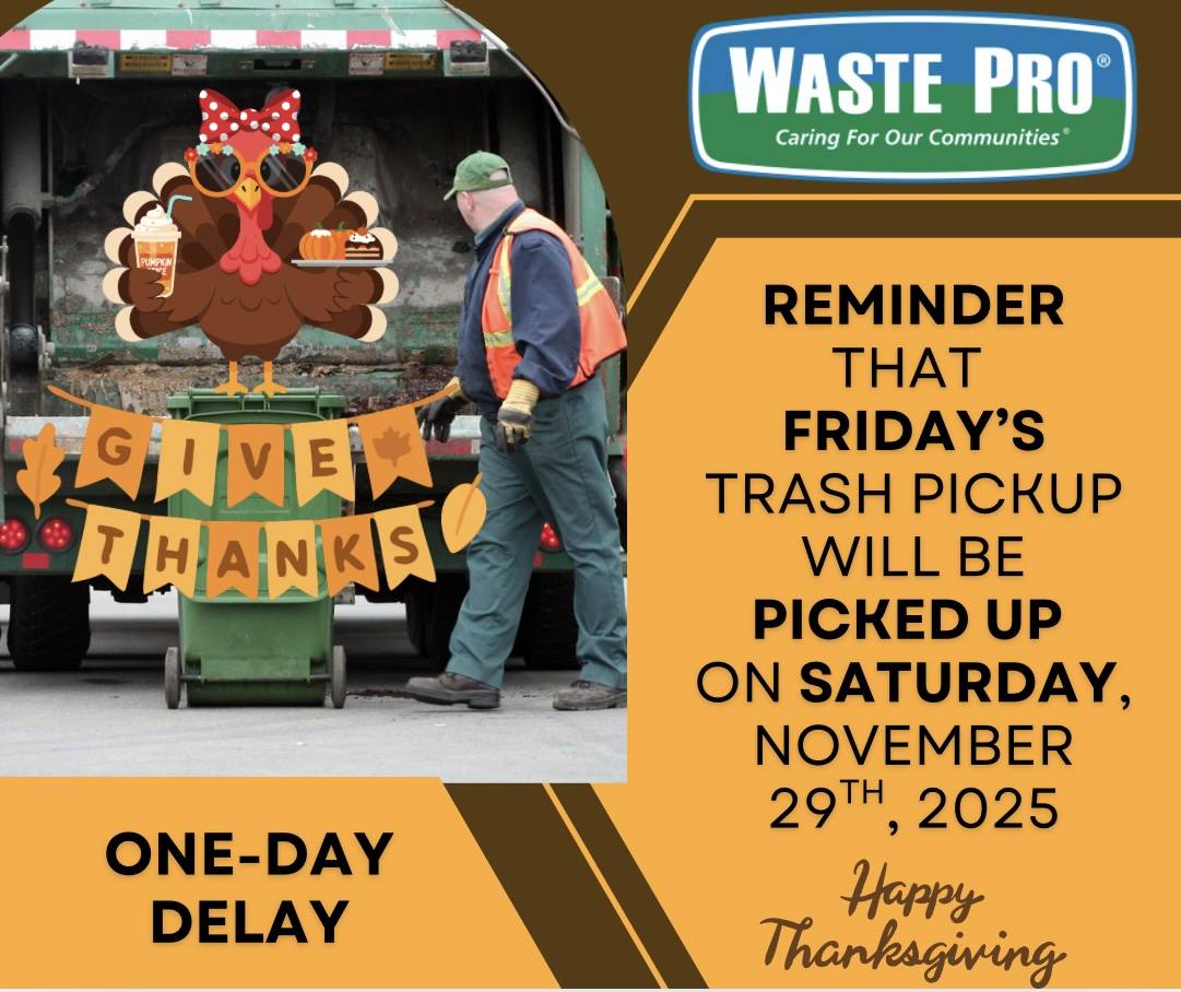 WastePro’s Friday pick-up will be delayed one-day to Saturday, November 29, 2025, because of the Thanksgiving holiday.