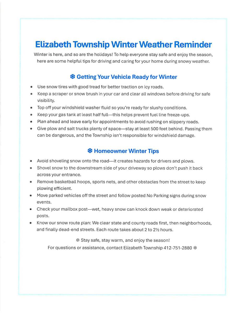 Winter is here! The public works department is asking for your cooperation and patience in making this a safe winter season for all. See attached flyer for recommendations.