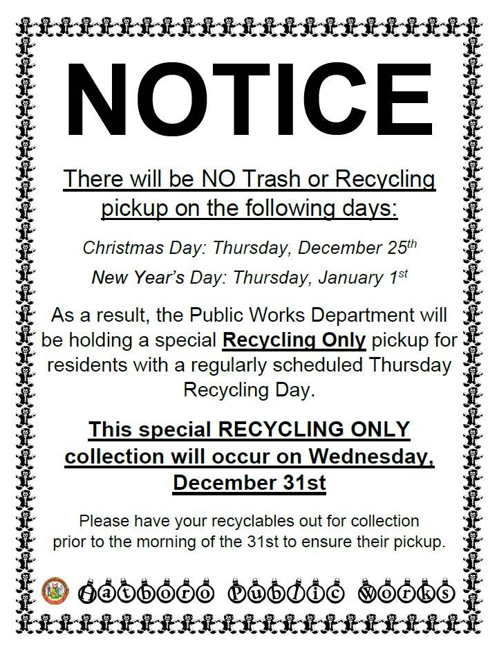 Attention Residents with Thursday Recycling! There will not be trash or recycling collection on Thursday, December 26th or Thursday, January 1st due to the Christmas and New Years holidays. As a result, Public Works is holding a special Recycling ONLY pickup on Wednesday, December 31st. This special recycling pickup is for residents with a regular Thursday recycling date ONLY. Residents with a Thursday recycling collection date should place their recyclables to the curb prior to the morning of December 31st to ensure their collection.