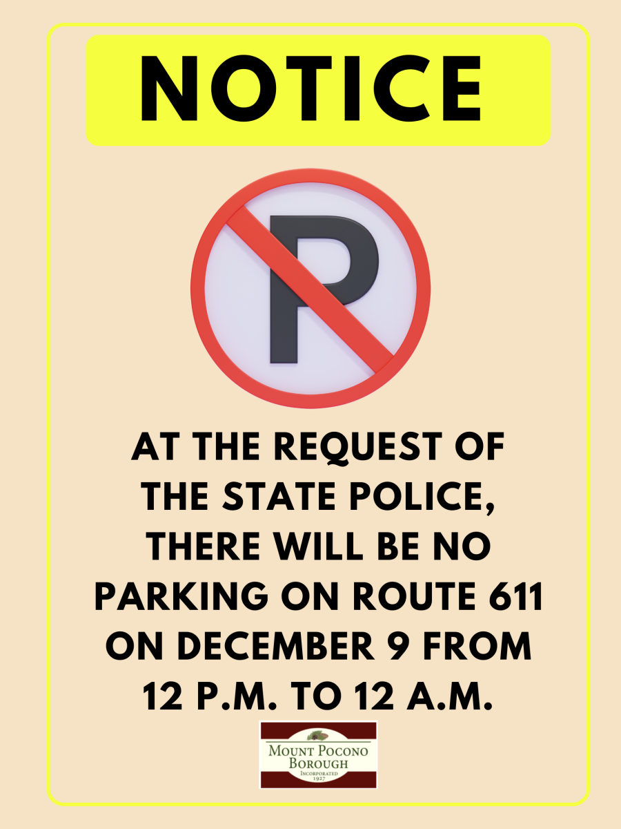 ‼️NOTICE‼️All parking along Route 611 will be prohibited on 12/9/25 from 12pm-12am at the request of state police. We advise all residents and businesses to plan accordingly.