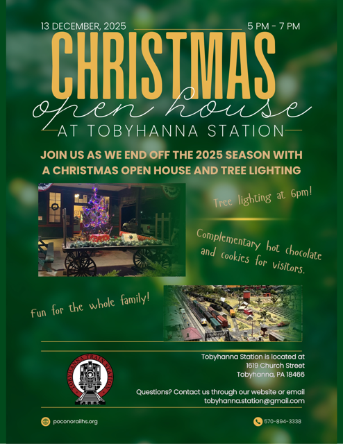 Join us at the Tobyhanna Station for our Christmas Open House on December 13, 2025, from 5pm–7pm! Enjoy a magical evening with a festive tree lighting ceremony at 6pm, plus complimentary hot chocolate and cookies. Fun for the whole family!
