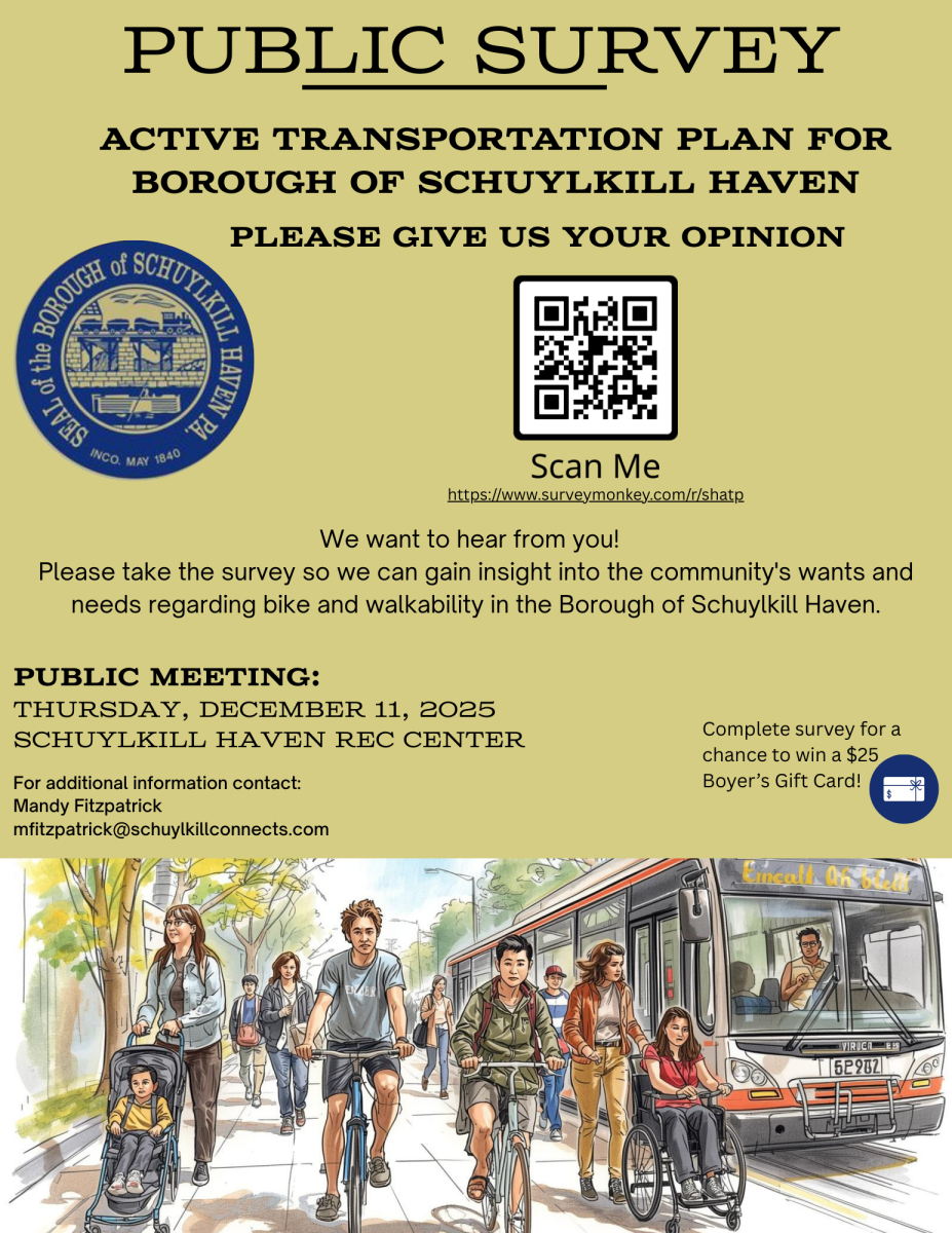 The Schuylkill Haven Active Transportation Plan Meeting will be tonight at 7 at the Recreation & Senior Center
