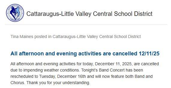 All afternoon and evening activities for today, December 11, 2025, are cancelled due to impending weather conditions. Tonight’s Band Concert has been rescheduled to Tuesday, December 16th and will now feature both Band and Chorus. Thank you for your understanding.