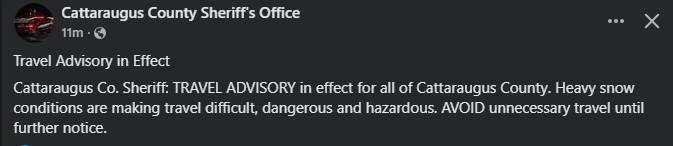 Cattaraugus Co. Sheriff: TRAVEL ADVISORY in effect for all of Cattaraugus County. Heavy snow conditions are making travel difficult, dangerous and hazardous. AVOID unnecessary travel until further notice.