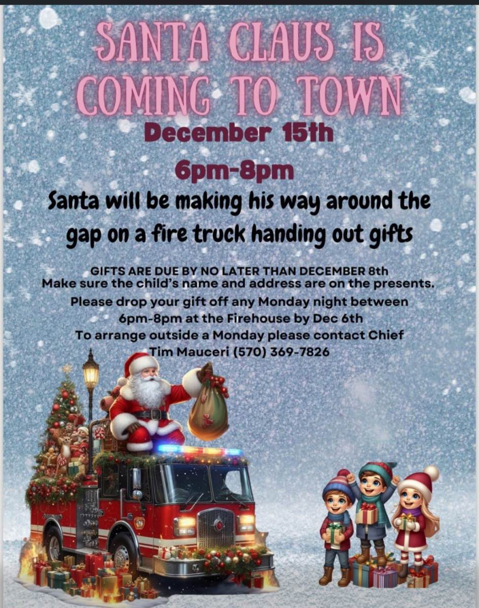 Santa is coming to town here in Delaware Water Gap! Due to popular requests, Santaโs helpers made a bit more room on their truckโฆso there is STILL time to get your gifts in to our Fire Company to have Santa deliver them to your children, big kids, doggies, etc. for tomorrow night! Contact Chief Mauceri (570)369-7826 to drop off your wrapped gifts and he will take care of the rest! This is always a great event and the kids love it!๐