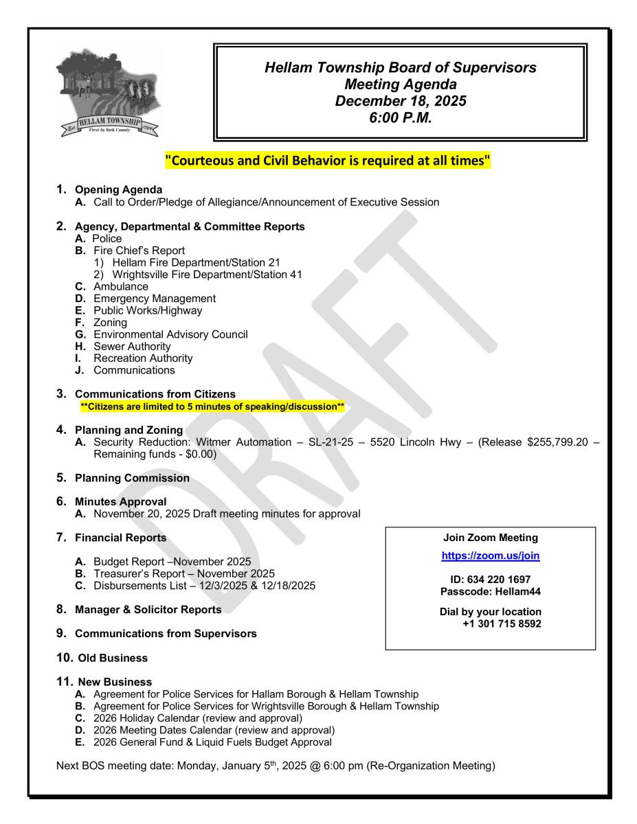 For more details please visit https://www.hellamtownship.gov/departments/public-meetings/
