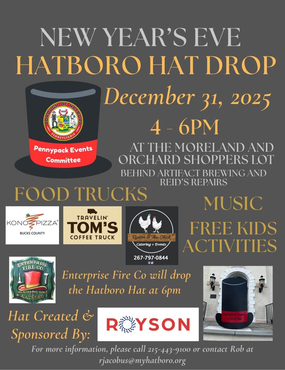 Any questions about this event, please reach out to Borough Hall at 215-443-9100 or email at info@myhatboro.org. We hope to see you at the event, and we hope that you stay in the Borough and have a drink or dinner at one of our many eateries. This event is being held in the business district to assist our business owners.