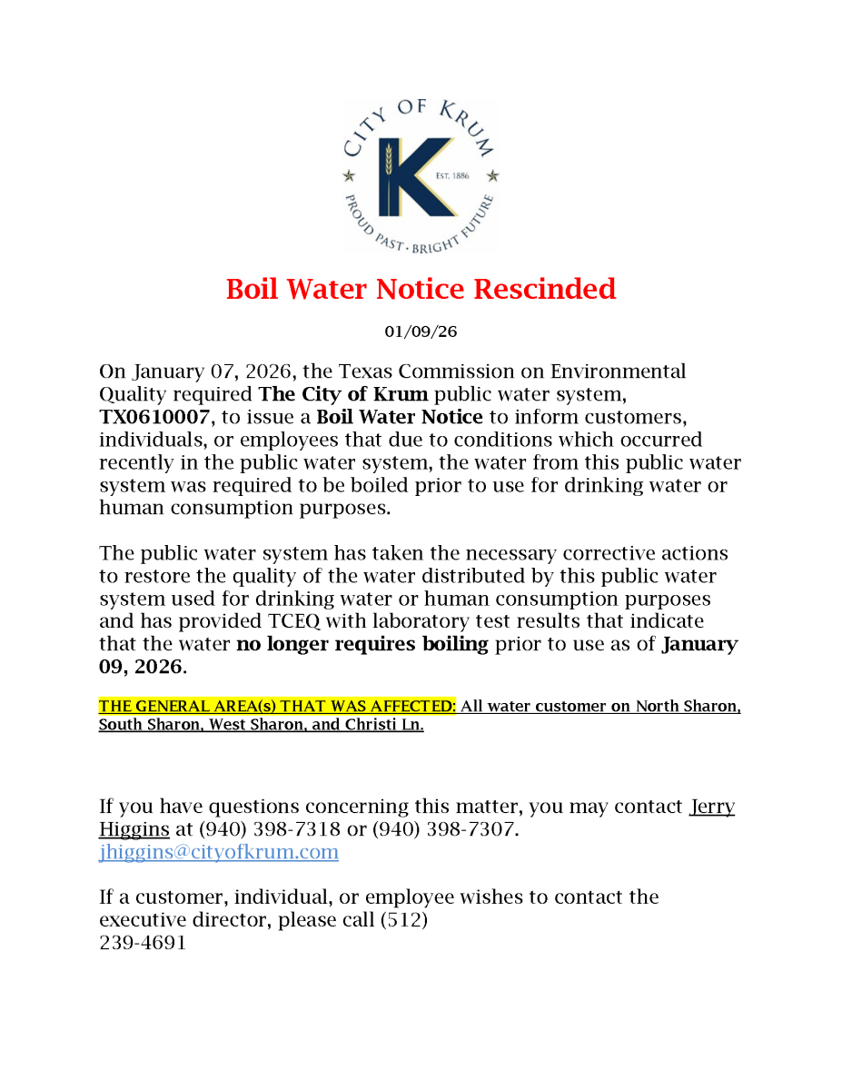 On January 07, 2026, the Texas Commission on Environmental Quality required The City of Krum public