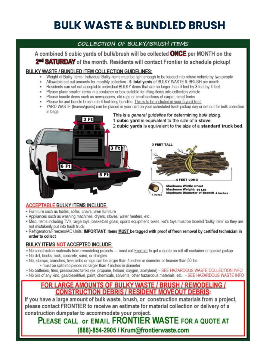 We have been informed by Frontier that the bulk pickup has been rescheduled to this coming Saturday, 1/17/2025, due to the holidays.