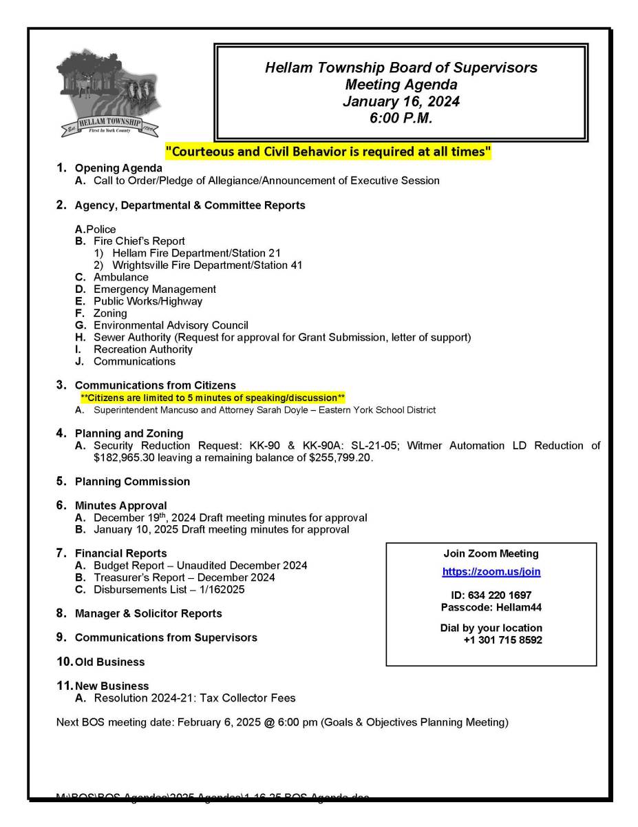 Ways to join: 📍 In-Person: Join us at the township building (please remember that courteous and civil behavior is required at all times). 💻 Online: Join via Zoom at https://zoom.us/join (ID: 634 220 1697 | Passcode: Hellam44). 📞 Phone: Dial +1 301 715 8592.