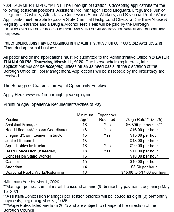 2026 SUMMER EMPLOYMENT: The Borough of Crafton is accepting applications for the following seasonal positions: Assistant Pool Manager, Head Lifeguard, Lifeguards, Junior Lifeguards, Cashiers, Attendants, Concession Stand Workers, and Seasonal Public Works. Applicants must be able to pass a State Criminal Background Check, a ChildLine Abuse & Registry Clearance and a Drug & Alcohol Test. Fees will be paid by the Borough. Employees must have access to their own valid email address for payroll and onboarding purposes.