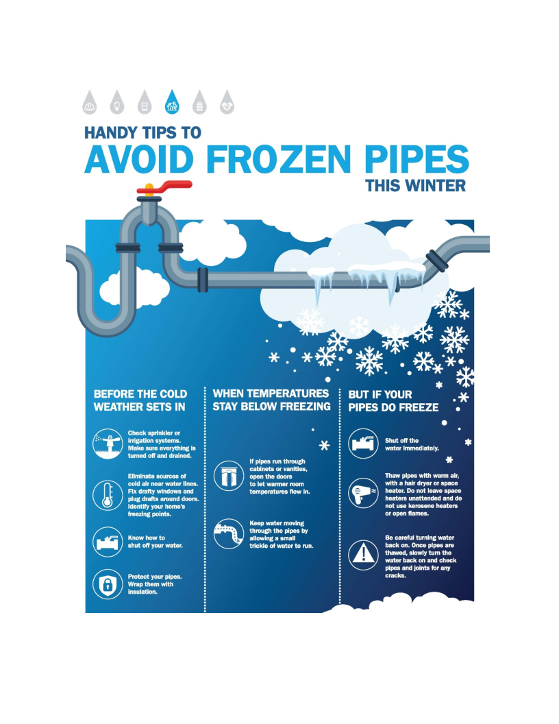 Public Works will have staff ready to address any leaks that might come up. Residents can protect their pipes by following these tips: