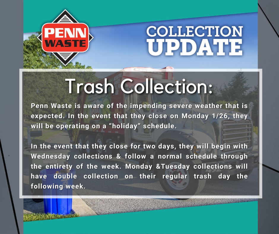 Penn Waste is aware of the impending severe weather that is expected. In the event that they close on Monday 1/26, they will be operating on a “holiday” schedule.