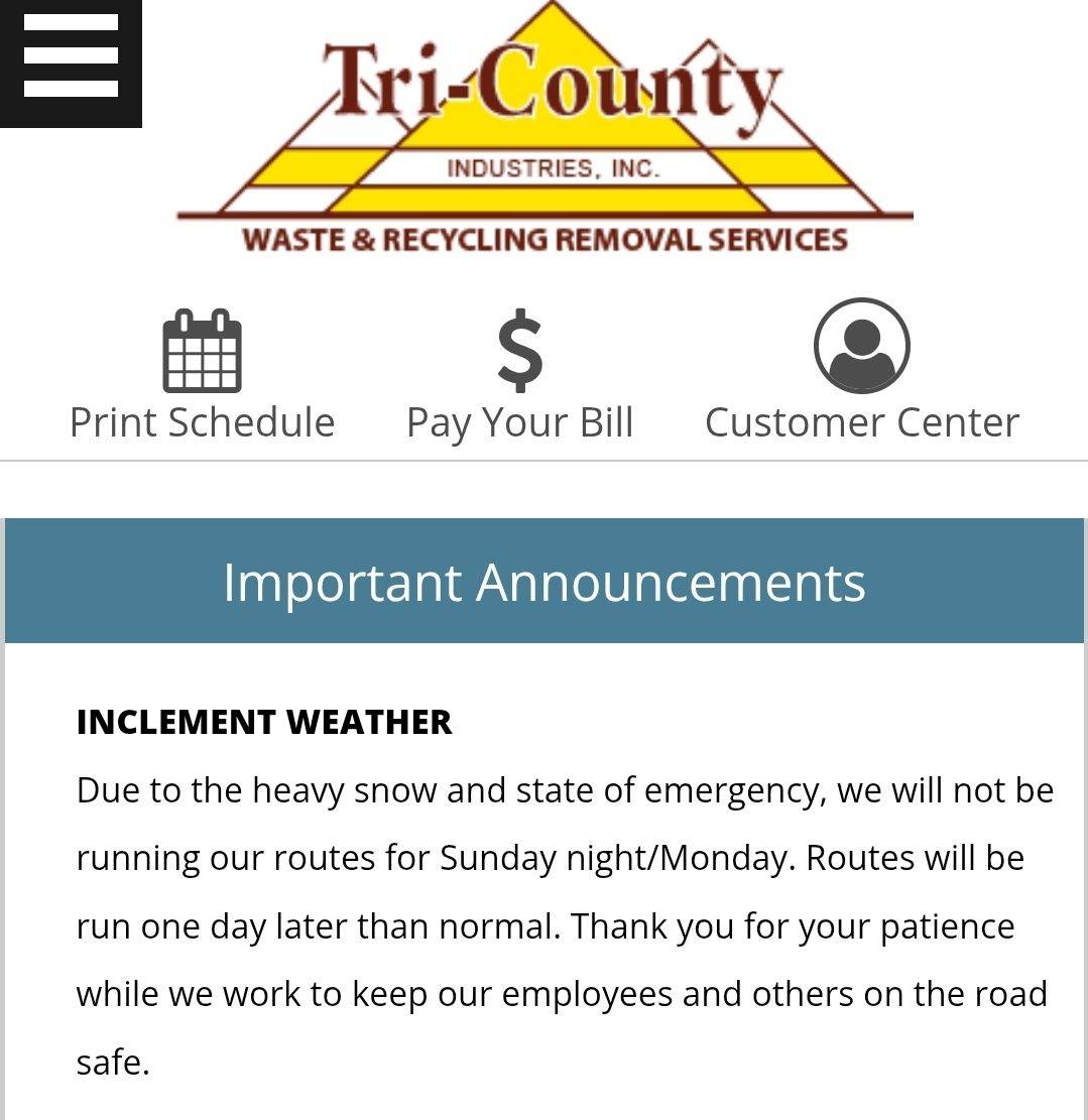 Due to weather conditions, Tri-County trash pickup in Harrisville Borough has been delayed by one day this week. Collection will occur one day later than the normal scheduled pickup.