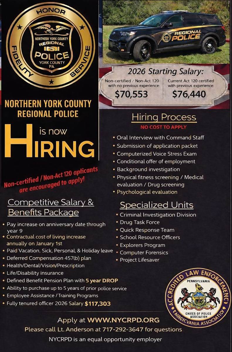 The Northern York County Regional Police Department is now accepting applicants for the position of Police Officer. Applicants that are non-certified police officers will be sent by the department to the Harrisburg Area Community College Police Academy in July 2026 to receive their Act 120 training. The department is also accepting applicants that are already certified police officers or are currently enrolled in a certified Act 120 police academy. To apply paste the following link into your search engine: