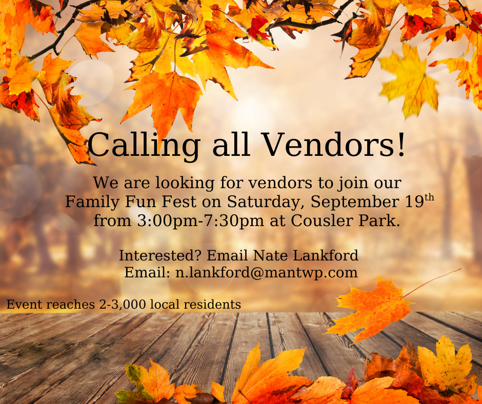 Looking for a venue to sell and market your products? Join us on Saturday, September 19th at Cousler Park from 3:00pm-7:30pm. See attached for more details.