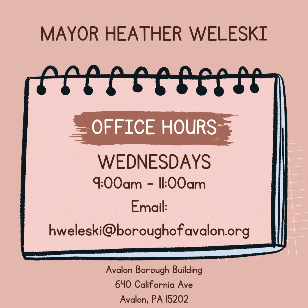 Mayor Heather Weleski will hold office hours at the Avalon Borough Hall on Wednesday mornings from 9:00 am - 11:00 am, beginning Wednesday, February 4, 2026. Bring your questions and concerns or just swing by to say hello and chat. Mayor Weleski looks forward to meeting with you.