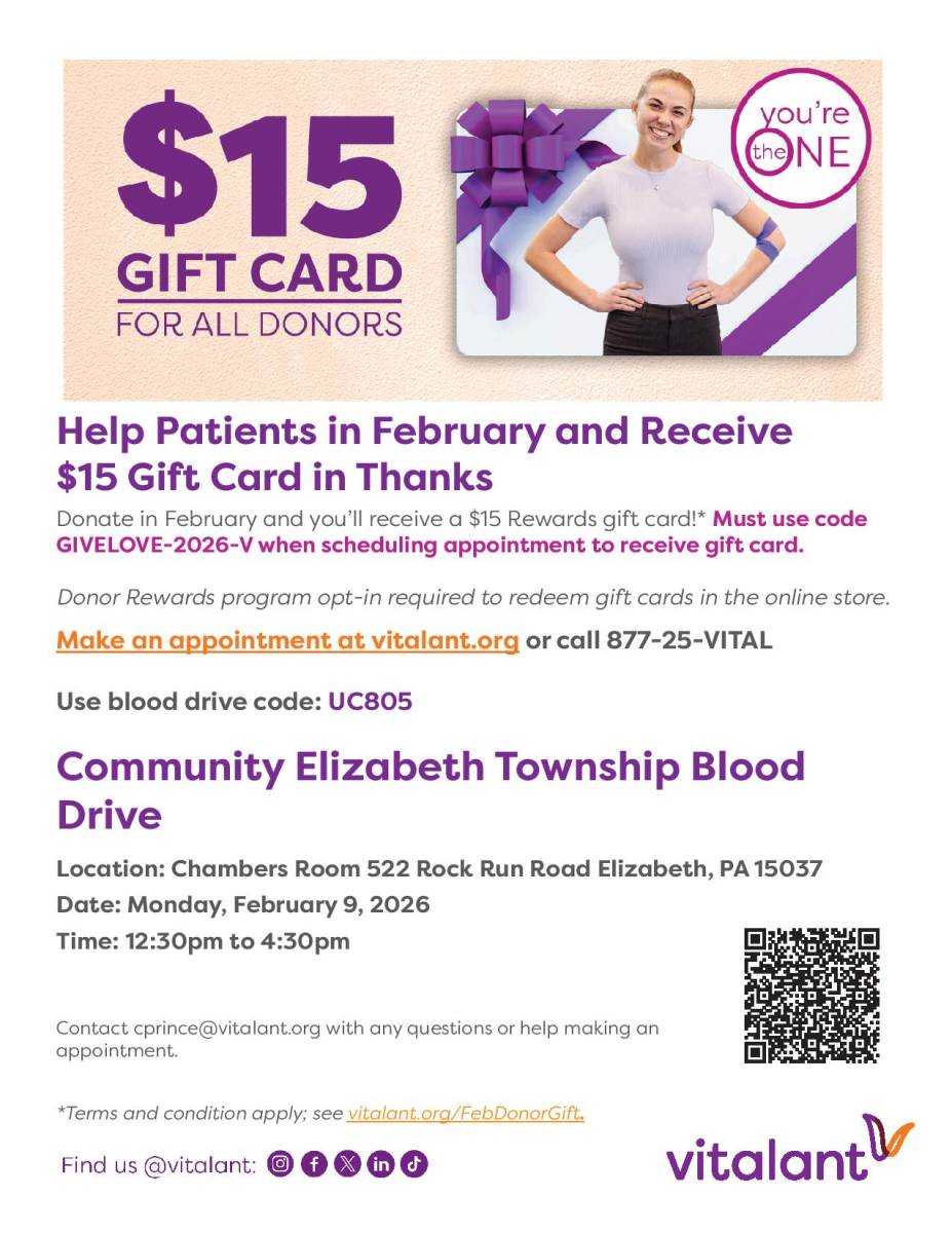 Join us in saving lives on TODAY, February 9th from 12:30 pm to 4:30 pm at the Elizabeth Township Municipal Building!