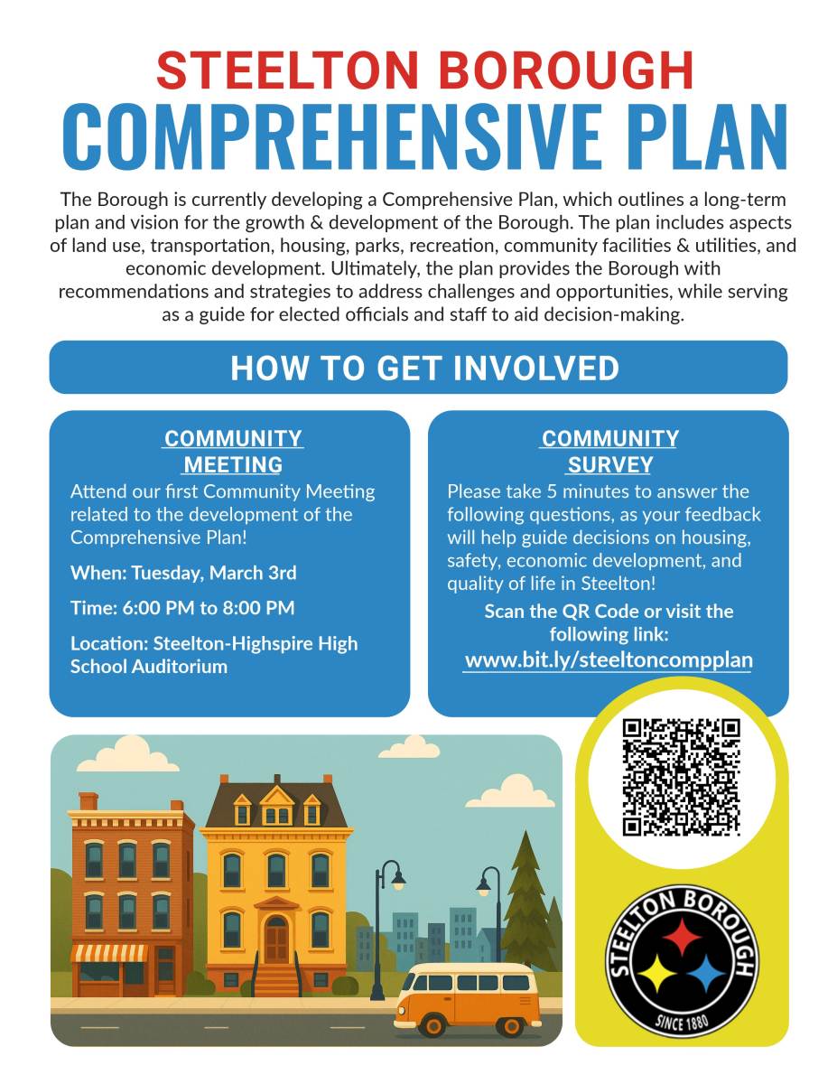- Community Meeting on 3/3 = Attend our first Community Meeting related to the development of the Comprehensive Plan on Tuesday, March 3rd, from 6:00 PM to 8:00 PM at Steelton-Highspire High School's auditorium (250 Reynders St, Steelton, PA 17113)