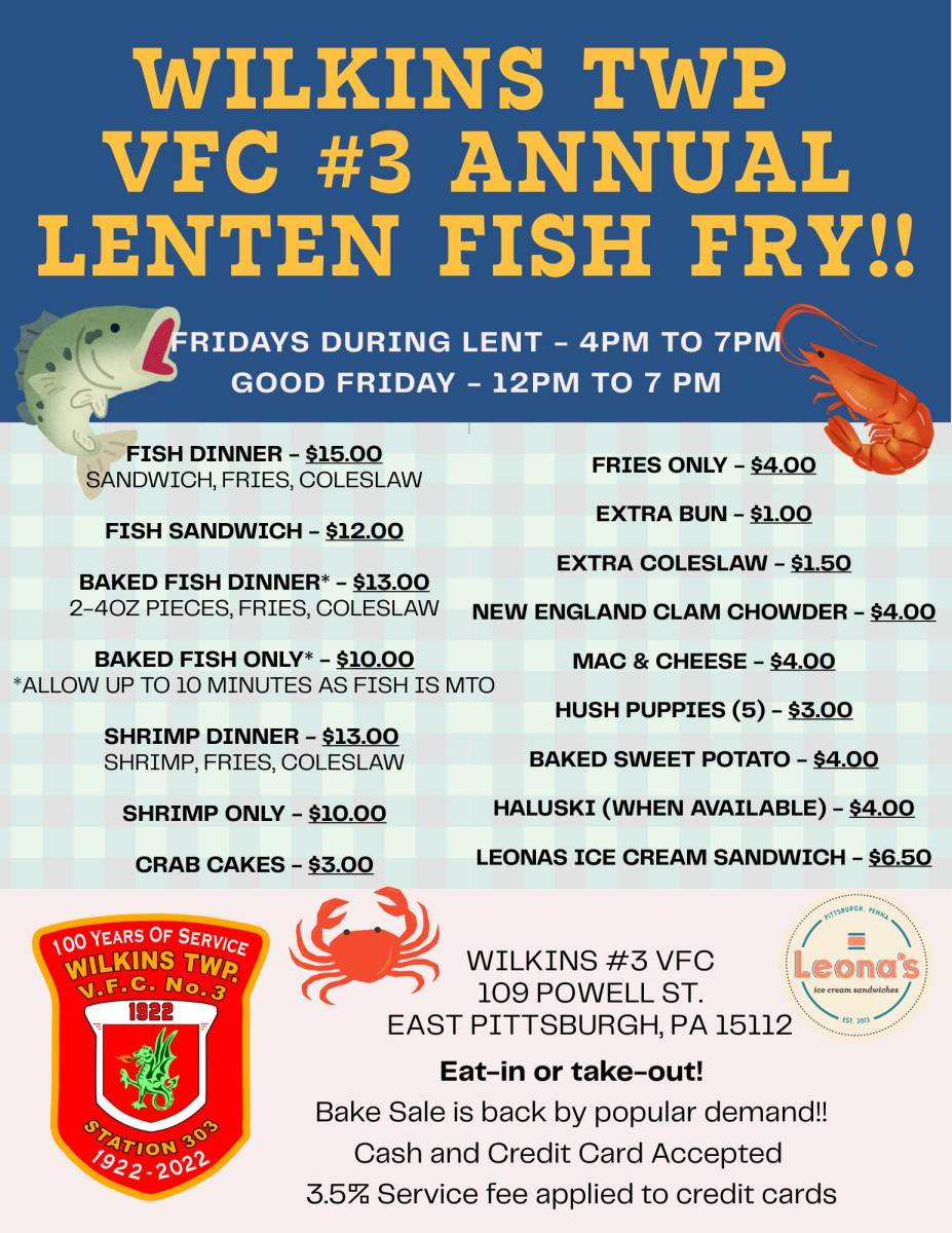 Come out every Friday during lent to support Wilkins Volunteer Fire Company #3. See the attachment for more details.