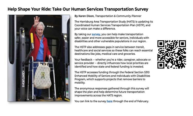 The Harrisburg Area Transportation Study (HATS) is updating its Coordinated Human Services Transportation Plan (HSTP), and your voice can make a difference!