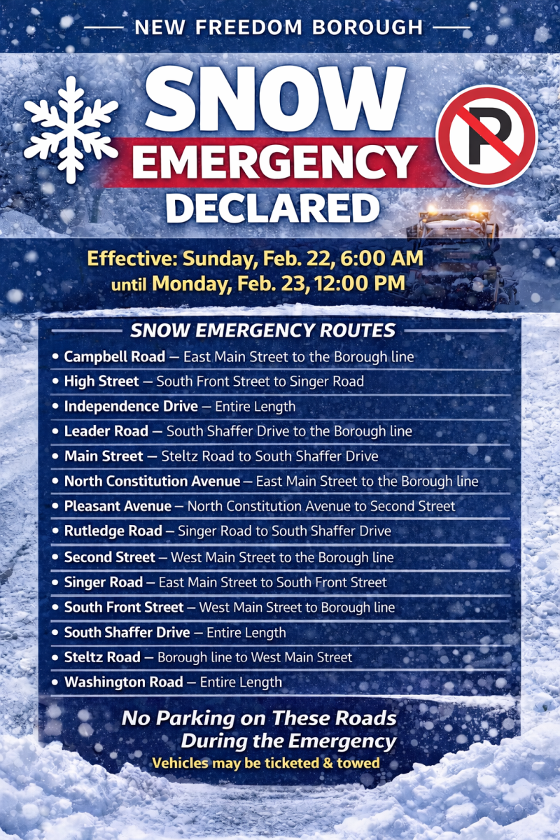 New Freedom Borough has declared a snow emergency starting Sunday, February 22 at 6:00 AM and continuing through Monday, February 23 at 12:00 PM. Please read below for key details to keep our streets clear and safe: