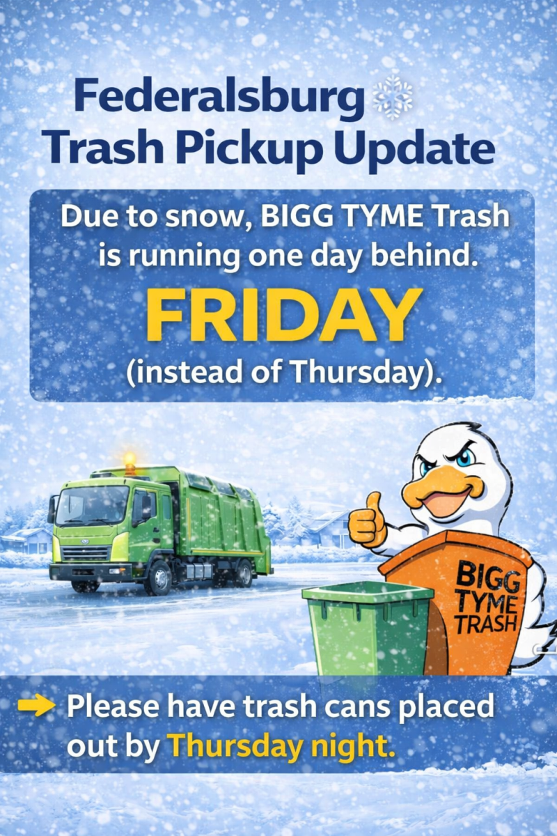 Due to snow, BIGG TYME Trash is running one day behind. This week’s pickup will be FRIDAY (instead of Thursday).