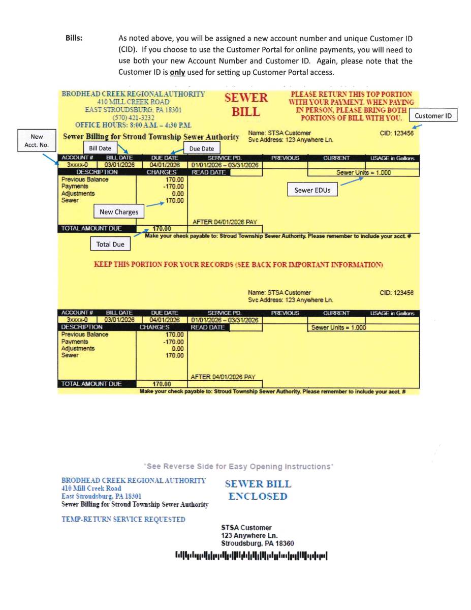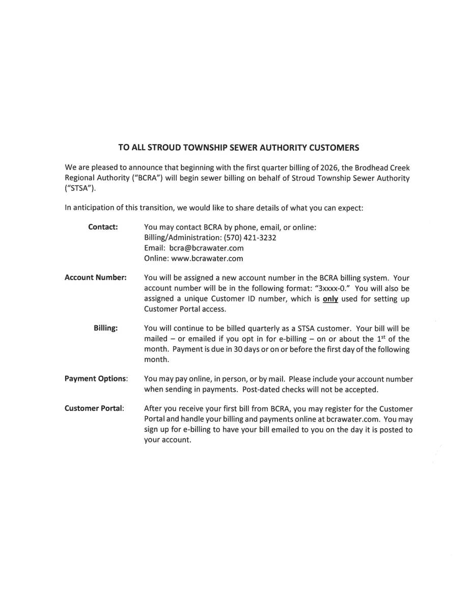 We are pleased to announce that beginning with your first quarter billing of 2026, the Brodhead Creek Regional Authority will begin sewer billing on behalf of Stroud Township Sewer Authority.
