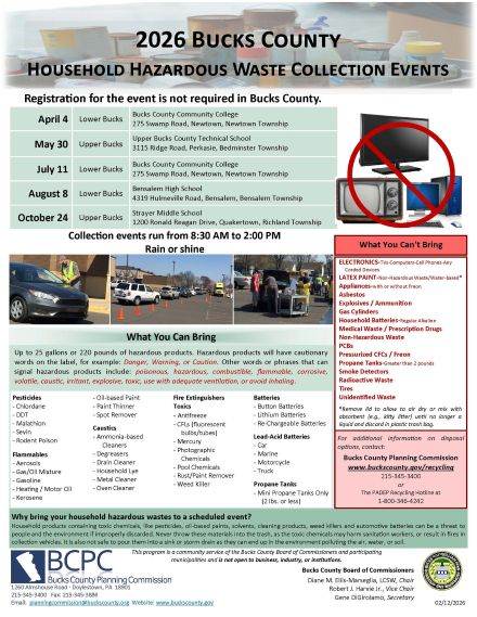 See the attached flyer for the 2026 dates for the Bucks County Household Hazardous Waste Collection