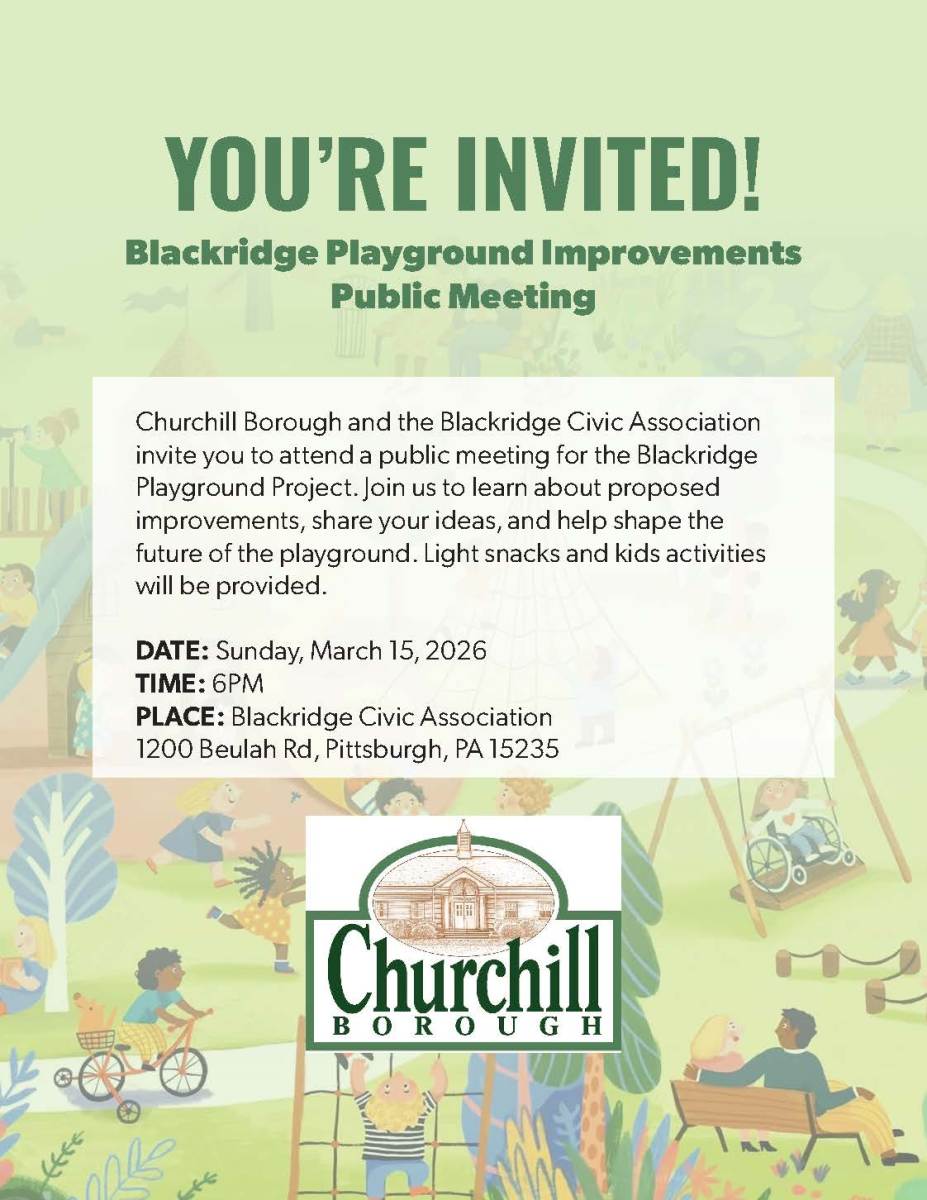 Churchill Borough and Blackridge Civic Association invite you to attend a public meeting for the Blackridge Playground Project. Join us to learn more about the proposed improvements, share your ideas, and help shape the future of the playground. Today, at 6 pm, at The Blackridge Civic Association, 1200 Beulah Rd, Pgh, PA 15235