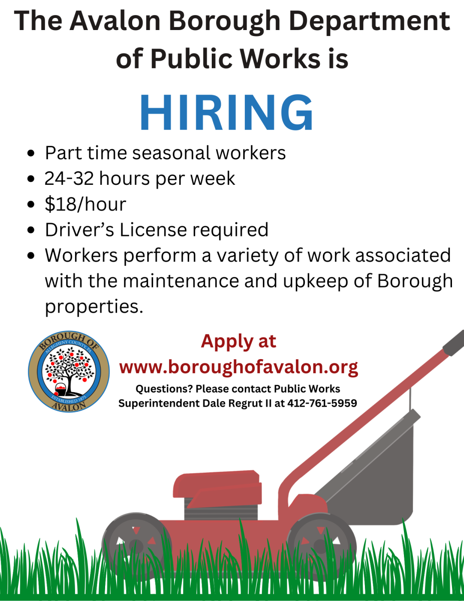 Public Works Part Time Employees, Borough of Avalon, Allegheny County – Applications are currently being accepted by the Borough Council for part time seasonal public works employees. These employees perform a variety of work associated with the maintenance, repair, and construction of DPW assets. The seasonal employees report to the Public Works Superintendent. Workers operate a variety of equipment, which may include hand tools, power tools, light equipment, riding lawn mower, push lawn mower, trimmers, and pickup trucks. Must have a valid driver’s license. Interested applicants should submit their application (available at www.boroughofavalon.org/employment/) to info@boroughofavalon.org or Manager, Borough of Avalon, 640 California Ave, Pittsburgh, PA 15202. Please call the Borough Administration Office at 412-761-5820 with questions. Applications will be accepted until the positions are filled.