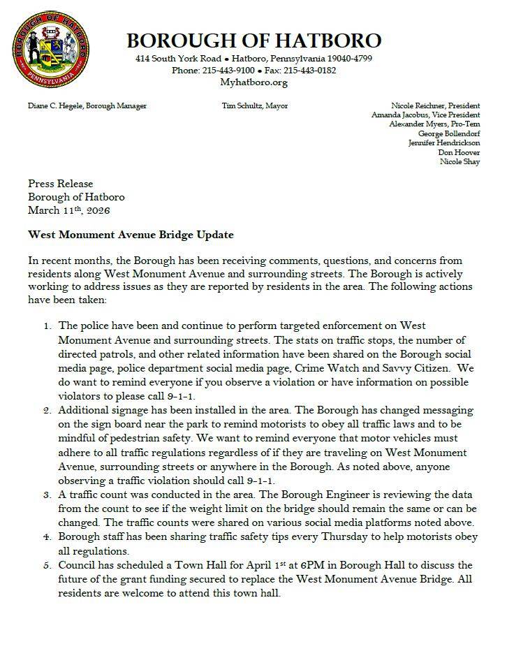 5. Council has scheduled a Town Hall for April 1st at 6PM in Borough Hall to discuss the future of the grant funding secured to replace the West Monument Avenue Bridge. All residents are welcome to attend this town hall.