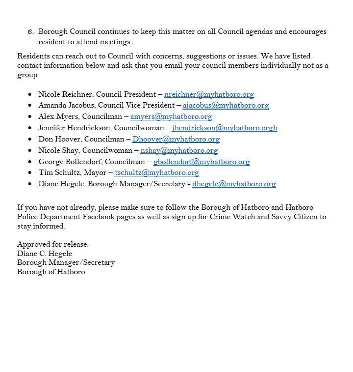 If you have not already, please make sure to follow the Borough of Hatboro and Hatboro Police Department Facebook pages as well as sign up for Crime Watch and Savvy Citizen to stay informed.
