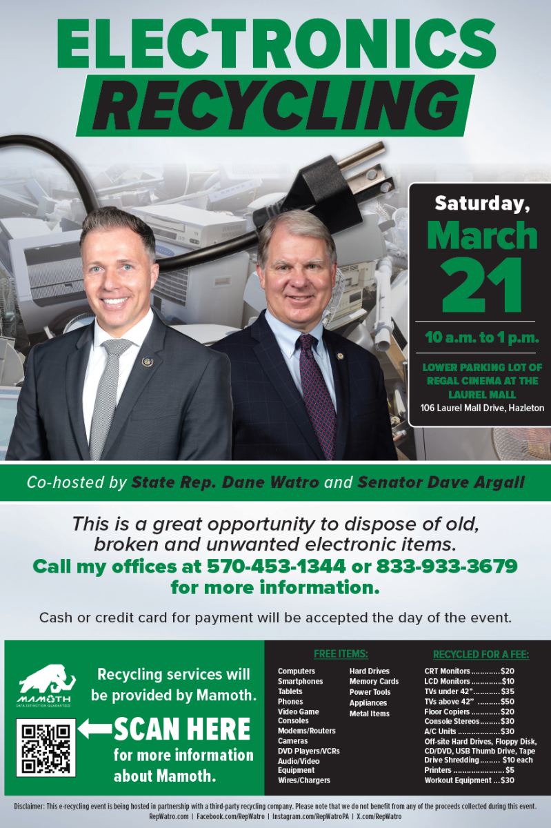 Rep. Dane Watro and Senator Argall are hosting an electronics recycling event at the Laurel Mall parking lot (lower parking lot of Regal Cinema) on Saturday, March 21 from 10 a.m. to 1 p.m. We can accept a variety of items—please see the flyer above for details. Please note that a fee will apply for larger items due to recycling costs.