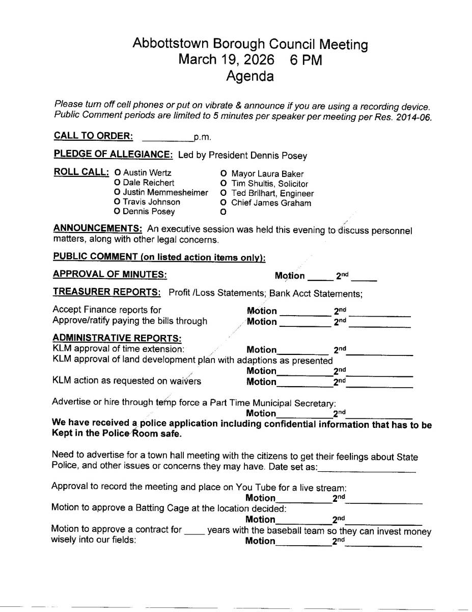 This notification was posted by Borough of Abbottstown. Borough of Abbottstown is solely responsible for this notification and unless specifically indicated, no other community or individual utilizing Savvy Citizen is sponsoring, responsible for, or endorsing this notification.