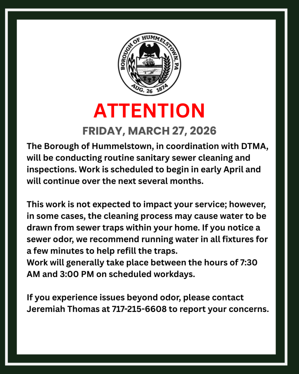 The Borough of Hummelstown, in coordination with DTMA, will be conducting routine sanitary sewer cleaning and inspections. Work is scheduled to begin in early April and will continue over the next several months.