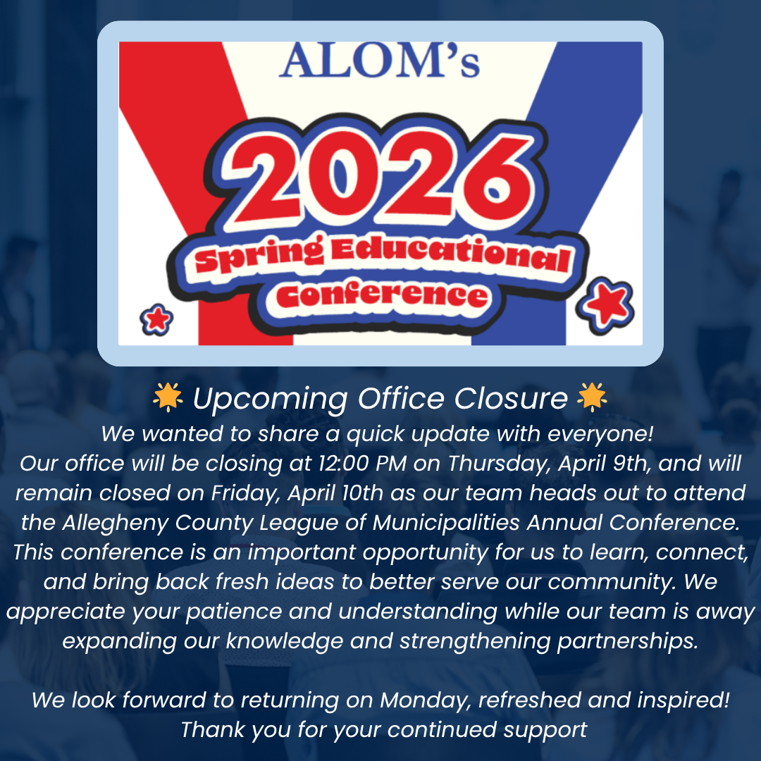 Please be advised that our office will close today, Thursday, April 9th at 12:00 PM and will remain closed on Friday, April 10th as our team attends the Allegheny League of Municipalities Annual Conference.