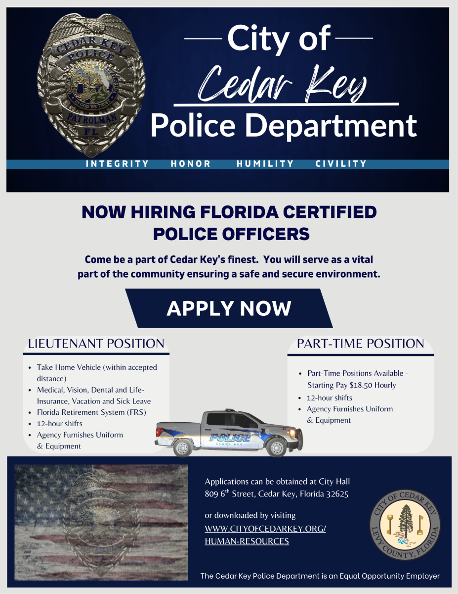 The Cedar Key Police Department is now hiring Florida-certified police officers for a Lieutenant and Part-Time positions. Come be a part of Cedar Key's finest and serve as a vital part of our community to ensure a safe and secure environment.