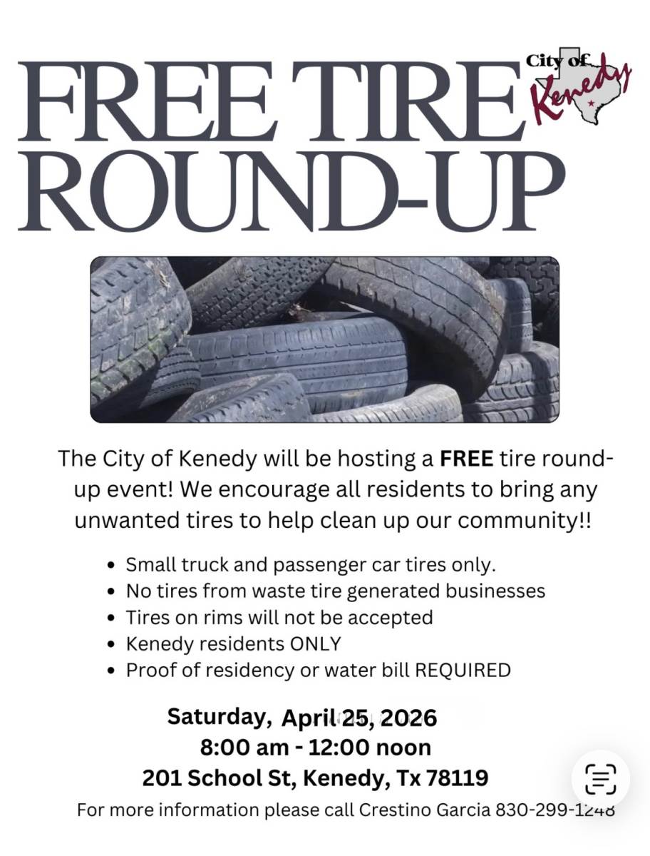 The City of Kenedy will be having a tire round-up. Please see flyer for more information.