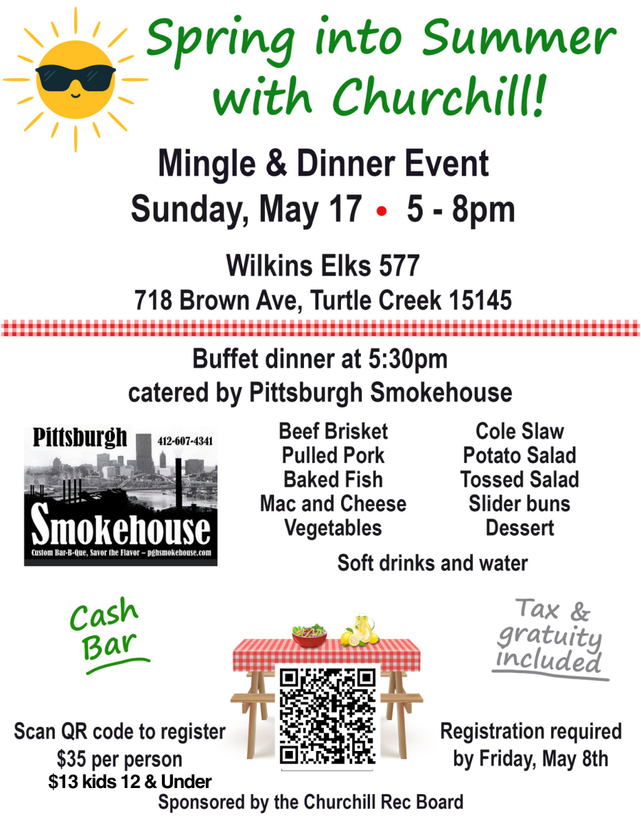 Invite your friends, neighbors, and family members to a mingle and dinner event on Sunday, May 17, 5-8 pm at the Wilkins Elks 577. The buffet dinner will be catered by Pittsburgh Smokehouse, $35 per person and $13 for kids 12 and under. Make sure to visit the borough website or scan the QR code on the flyer for more information and to register as soon as possible! https://www.churchillborough.com/community/recreation-board/community-dinner