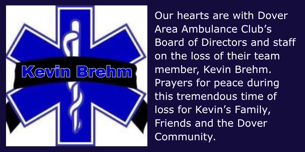 Our hearts are with Dover Area Ambulance Club’s Board of Directors and staff on the loss of their team member, Kevin Brehm. Prayers for peace during this tremendous time of loss for Kevin’s Family, Friends and the Dover Community.